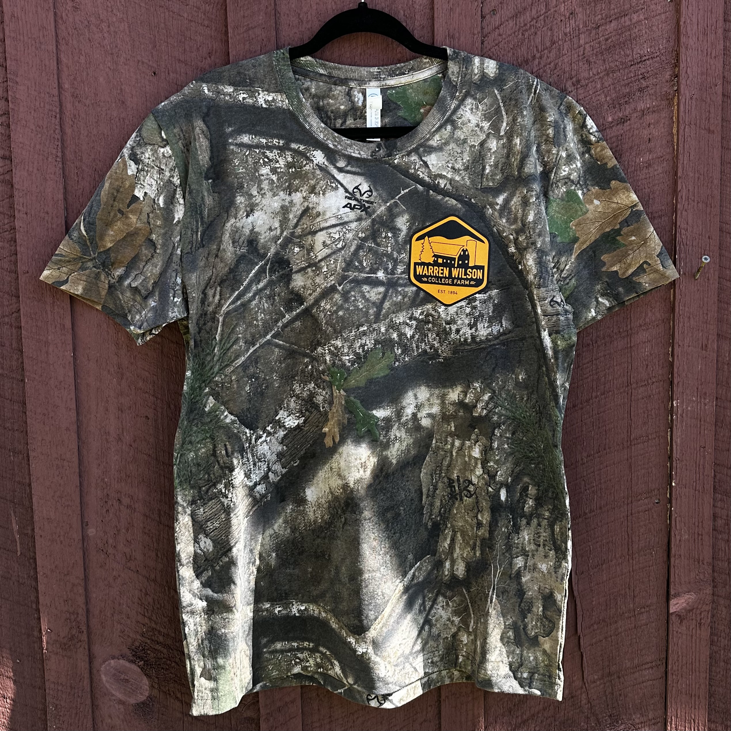 Warren Wilson College Camo T-shirt with a map outline on the back